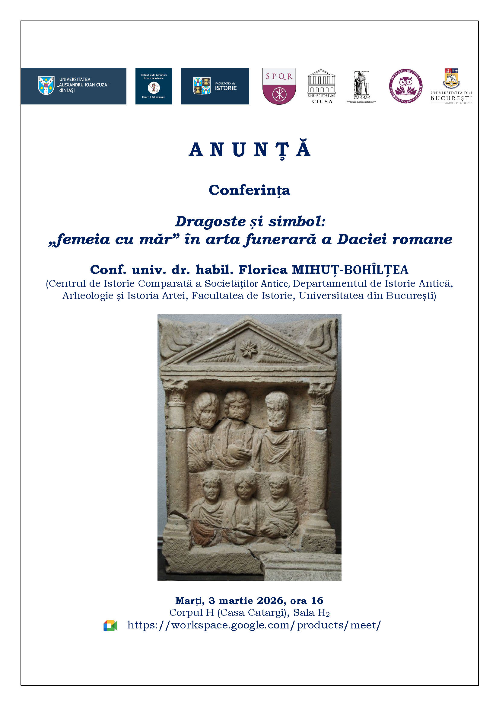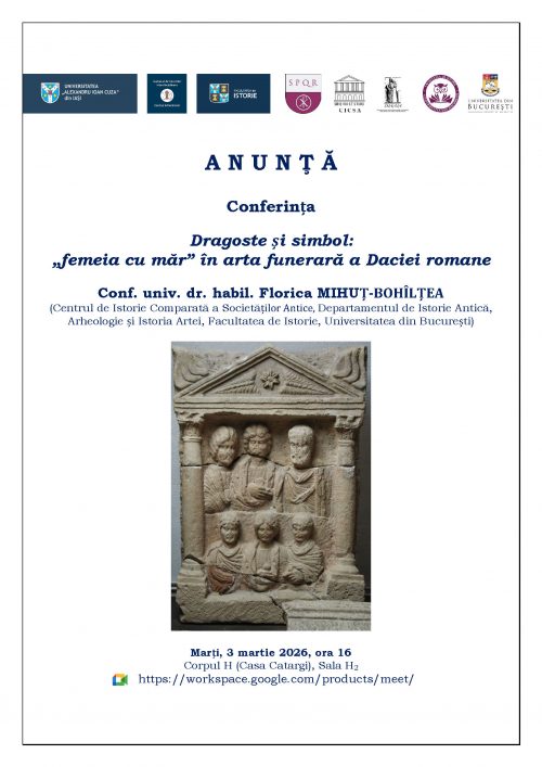 • 3 martie 2026 – Conferința: Dragoste și simbol: „femeia cu măr” în arta funerară a Daciei romane